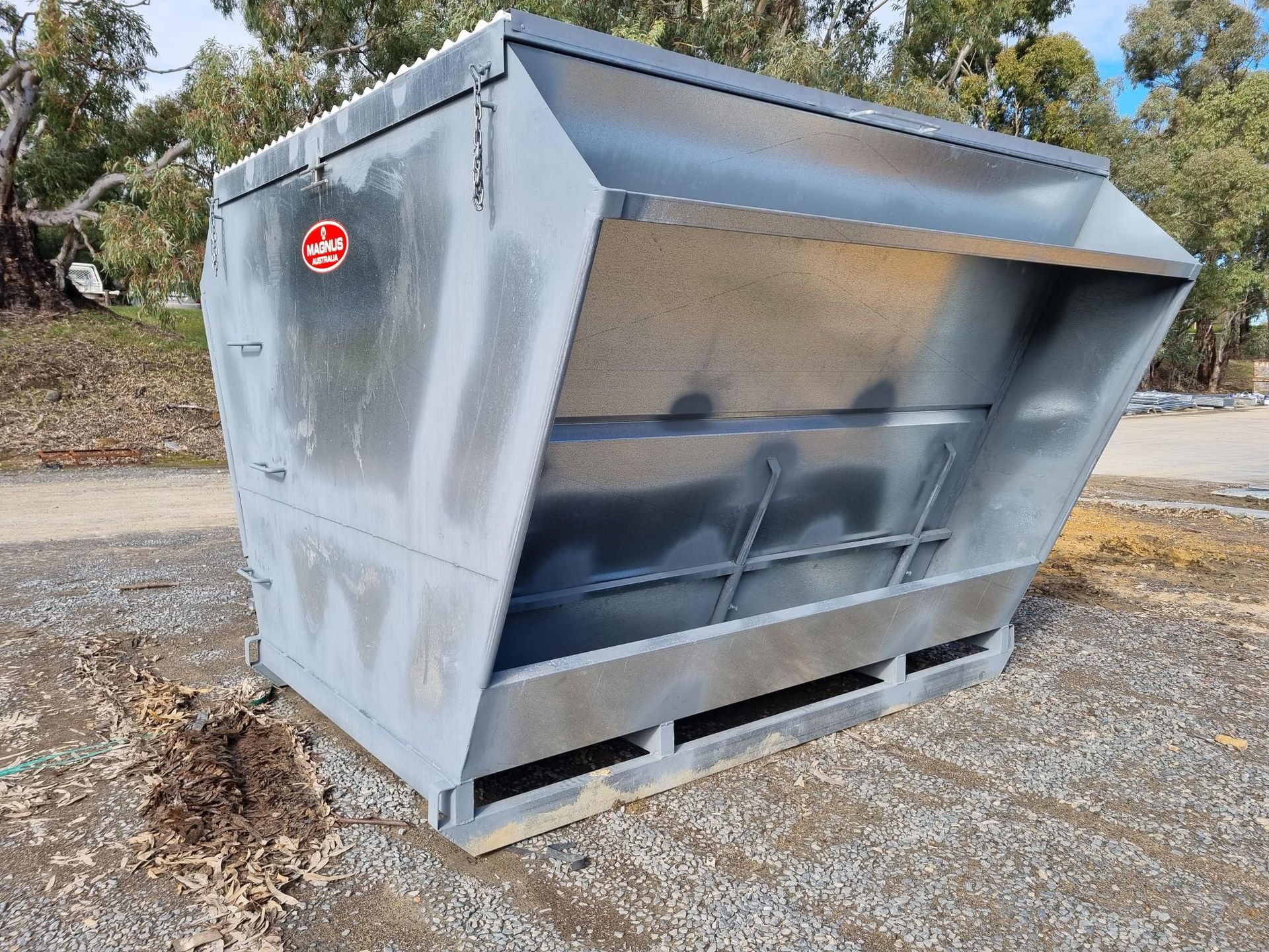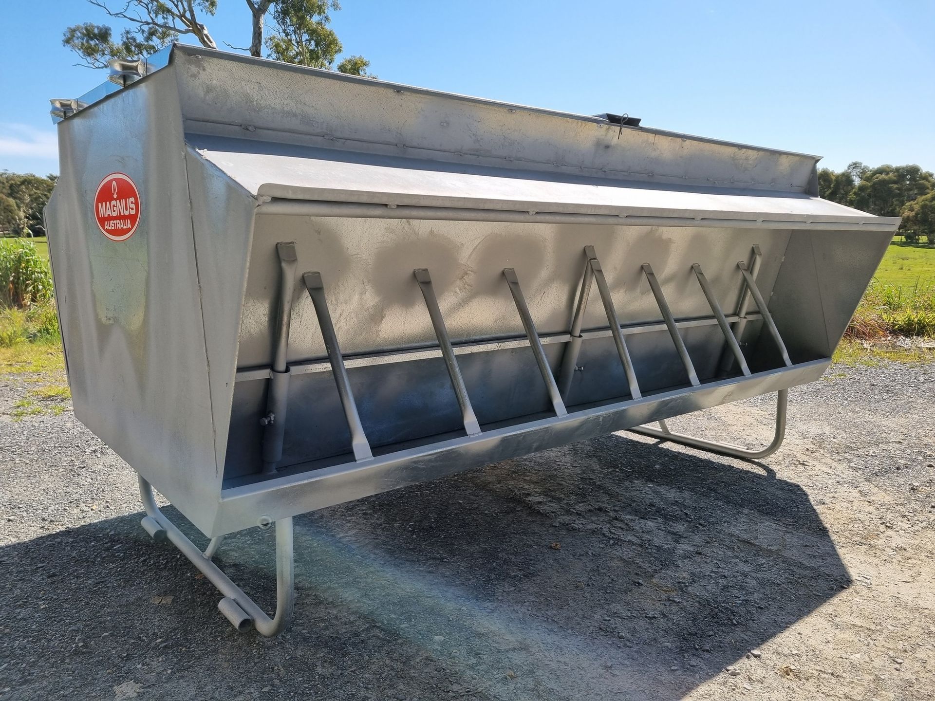 Our heavy‑duty cattle grain feeder provides more than 5 cubic metres of capacity, making it a reliable option for larger feeding programs. Like all Magnus equipment, these feeders feature galvanised steel construction, practical design, and components that stand up to the elements. The large cattle feeder is pictured below.